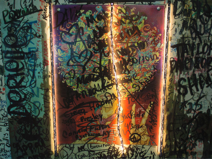 In February of 2013, I traveled to Clarksdale Mississippi to see the graffiti, first hand. The visual impact was astonishing. The feeling was similar to when I discovered my unintentional drawings years before. I stayed for two days in Clarksdale collaborating with photographer Evy Mages taking thousands of images of the club walls, ceilings and furnishings. They were all taken in low light and hand held. I selected the most poignant images, knowing I was going to light them and had them printed on 3’x2′ Epson premium photo paper-enhanced matte. Painted and scratched neon tubing was then used to highlight, deconstruct and reinvent the original images.